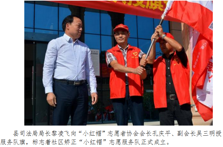 为进一步提高社区矫正工作质量,通城县司法局积极探索特殊人群管理模式,创新矫正工作载体,帮助服刑人员提高服务和奉献意识,矫正不良行为,顺利回归社会,有效预防和减少重新犯罪,与县“小红帽”志愿者协会密切合作,联合成立一支全部由社区服刑人员组成的特殊志愿者队伍----社区矫正“小红帽”志愿服务队。