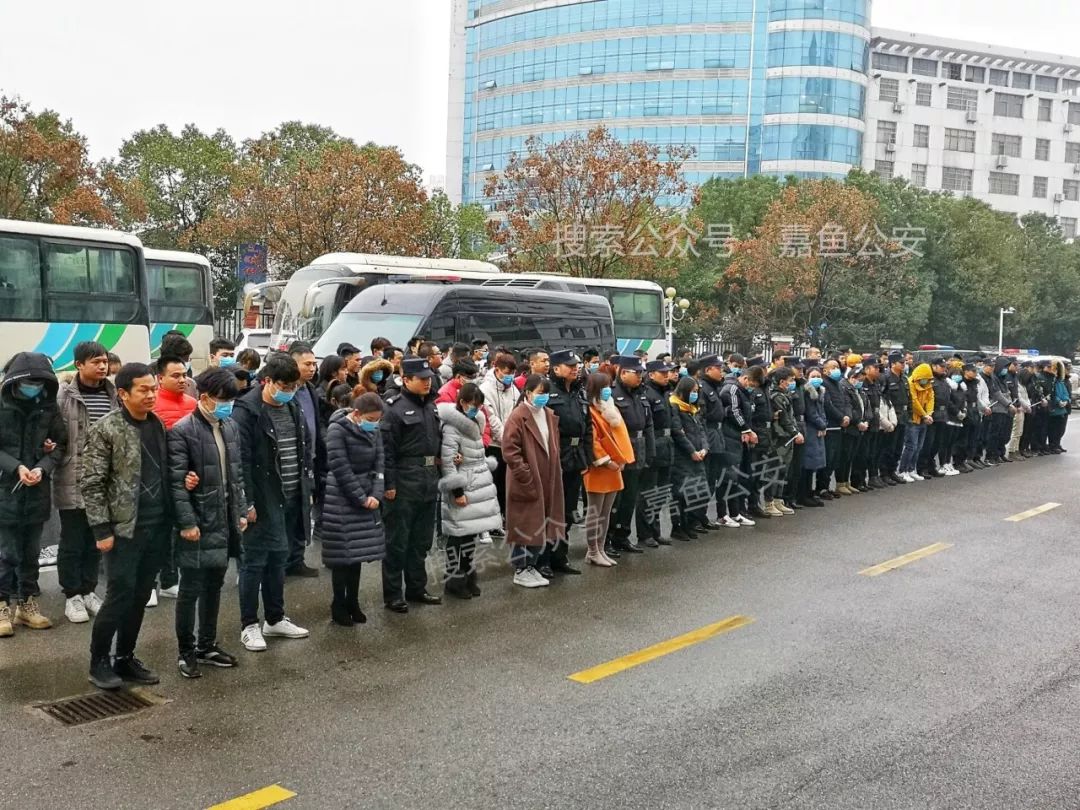 1月10日下午5点左右,72名犯罪嫌疑人乘坐的班车到达嘉鱼县公安局,3辆大巴车和1辆警车被塞得满满当当。