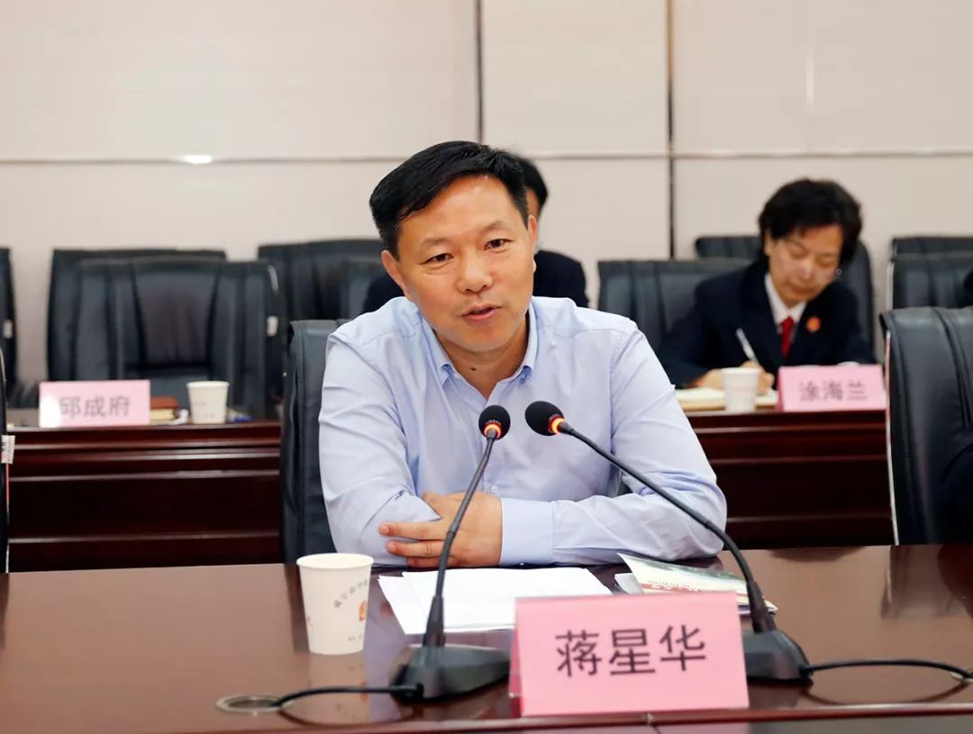 座谈会上,蒋星华同志代表市委、市政府对调研组的到来表示热烈欢迎,并介绍了咸宁的历史、人文、经济发展等情况。倪贵武同志就全市法院工作和服务保障高质量发展情况作了汇报。与会人员就服务和保障民营企业发展、优化营商环境等提出意见和建议。