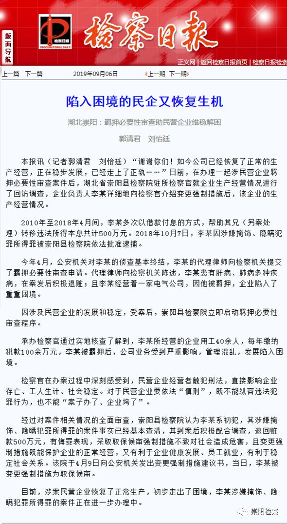 组织开展公众开放日活动,邀请民营企业家代表走进检察机关,听取意见建议。 走访民营企业,了解企业生产经营情况与司法需求。(图为崇阳县检察院党组书记、检察长孙峥走访民营企业) 检察官与办民警对受侵害企业进行案后回访 镜头之外,检察官依法展开羁押必要性审查,充分考虑案后表现,杜绝“案子办了,企业垮了”的现象。 崇阳县检察院党组成员、副检察长丁南山实地进行补植复绿督导 创新主体涉嫌非法占用农用地罪,依法全面审查后,涉案面积未达到立案标准,依法作出不批准逮捕决定,同时责令涉案合作社补办林地征用许可证、按标准补植复绿。 下一步,崇阳县检察院将立足法律监督职能,不断探索完善保障服务民营经济健康发展的新路径、新方式,为县域民营经济健康发展贡献检察力量。