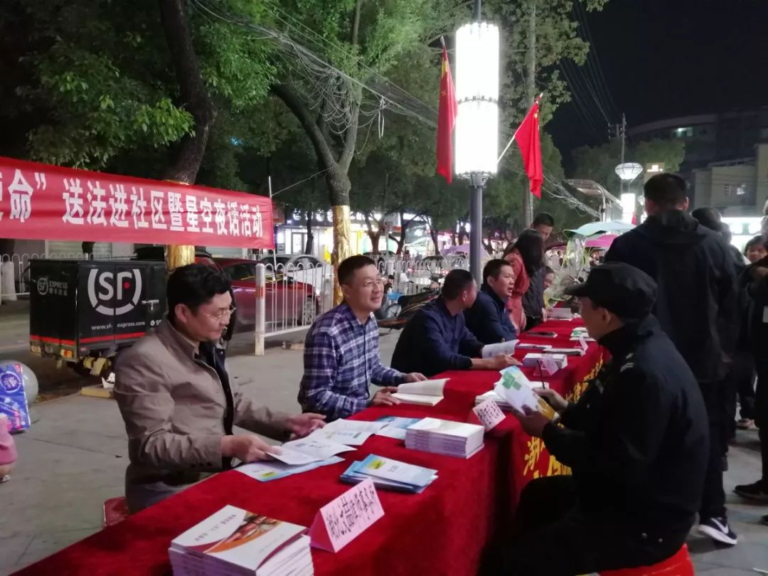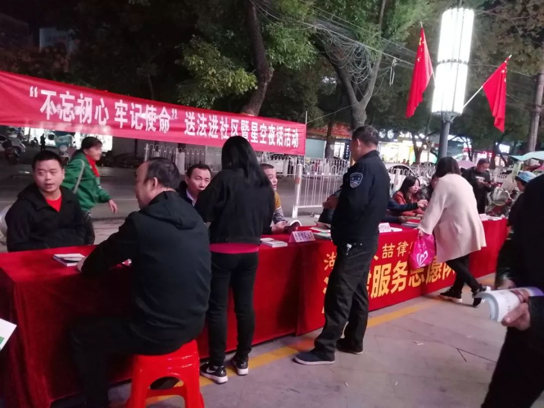 10月17日晚上,赤壁市司法局组织湖北文喆律师事务所联合蒲圻办事处和尚岭社区在傍晚人群聚居地西湖国际广场共同开展了一场主题为“不忘初心、牢记使命”送法进社区暨星空夜话活动,利用休息时间为社区居民提供义务法律咨询和法治宣传活动。 活动现场,工作人员向过往群众发送普法宣传资料300余份。文喆律师事务所的法律服务志愿者向群众现场解答法律咨询30余人次, 整个活动持续了2小时。 赤壁市司法局局长沈卫华也到现场参加活动,亲自向社区群众讲解赤壁市推进公共法律服务体系建设落实的各项惠民措施。