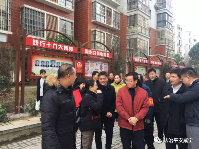 图为检查组实地考察赤壁市永帮小区平安建设和法治文化建设