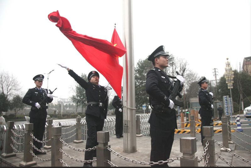 日月其迈,时盛岁新。在庄严的国歌声中,五星红旗迎风飘扬。全体民警以崭新的姿态、蓬勃的精神面貌,面向国旗齐唱国歌,注目五星红旗冉冉升起。