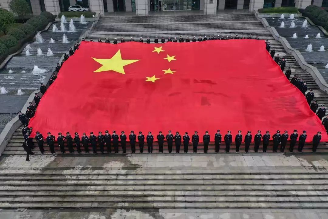用手中挥舞的五星红旗和婀娜的体态,连成闪耀的“双心”,在动静结合中吐露青春风华,致敬“平安中国”!